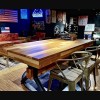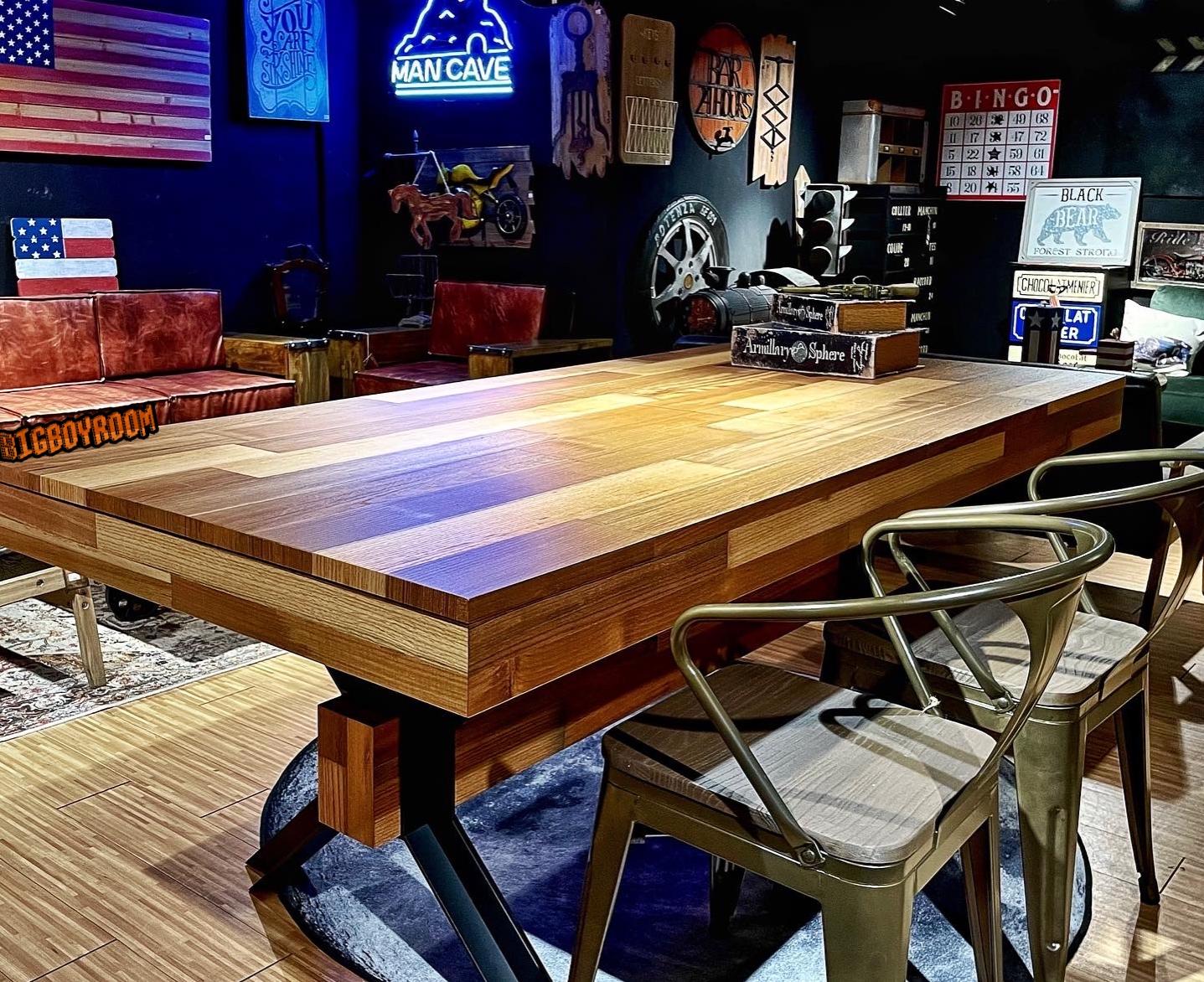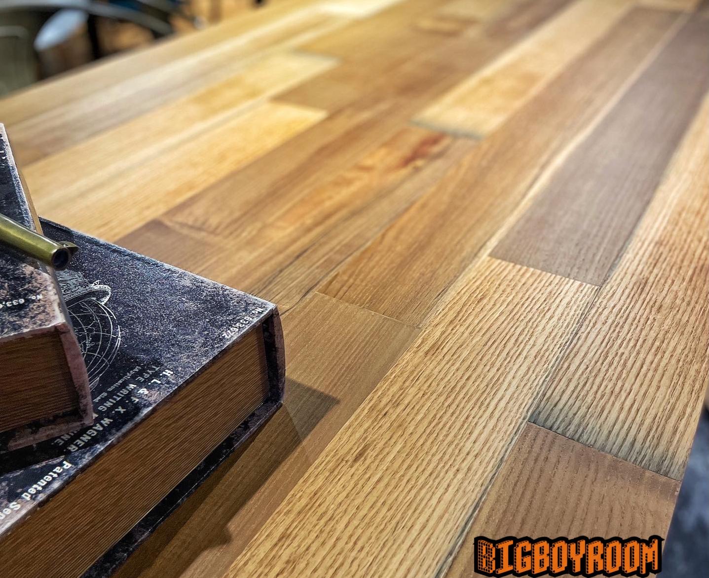 桌面蓋板:拼接舊木紋實木皮(butcher-block 視覺),存在感強。(餐桌模式)