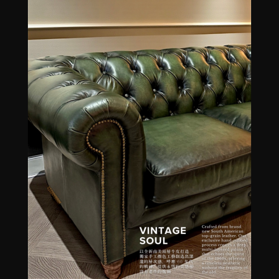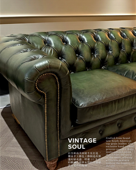 Style C 以 Chesterfield 代表性的深拉扣與菱格紋為基礎,復刻百年歐美經典比例,搭配南美頭層半苯染工藝牛皮, 將高度控制在 76cm、座深延伸至 97cm,在沈穩量體與輕盈視覺之間取得平衡。245cm 三人座提供寬闊橫向空間, 既能三人並坐,也適合兩人各據一側半躺放鬆;若是大坪數客廳,300cm 加長款則帶來更充裕的視覺與使用尺度。 南美頭層牛皮在大面積拉扣與扶手轉折處自然產生細緻皺褶,結合實木框架、羽絨與高密度坐墊,將英式會所般的氛圍帶入日常居家。