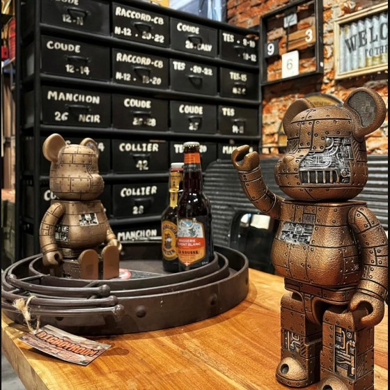 Medicom Toy 此次將蒸汽龐克的科幻機械風格注入並做結合,喚起燃煤爐轟隆隆聲、蒸汽的嘶嘶聲和19世紀工程的所有浪漫,用錫鑄造並賦予石墨處理的青銅飾面以模擬風化的鐵,選擇性缺失的面板,暴露了自動機的錫製儀錶板和導管的內部工作原理,交由Royal selangor打造全錫製造的Be@rbrick