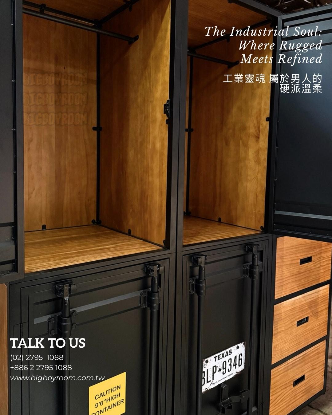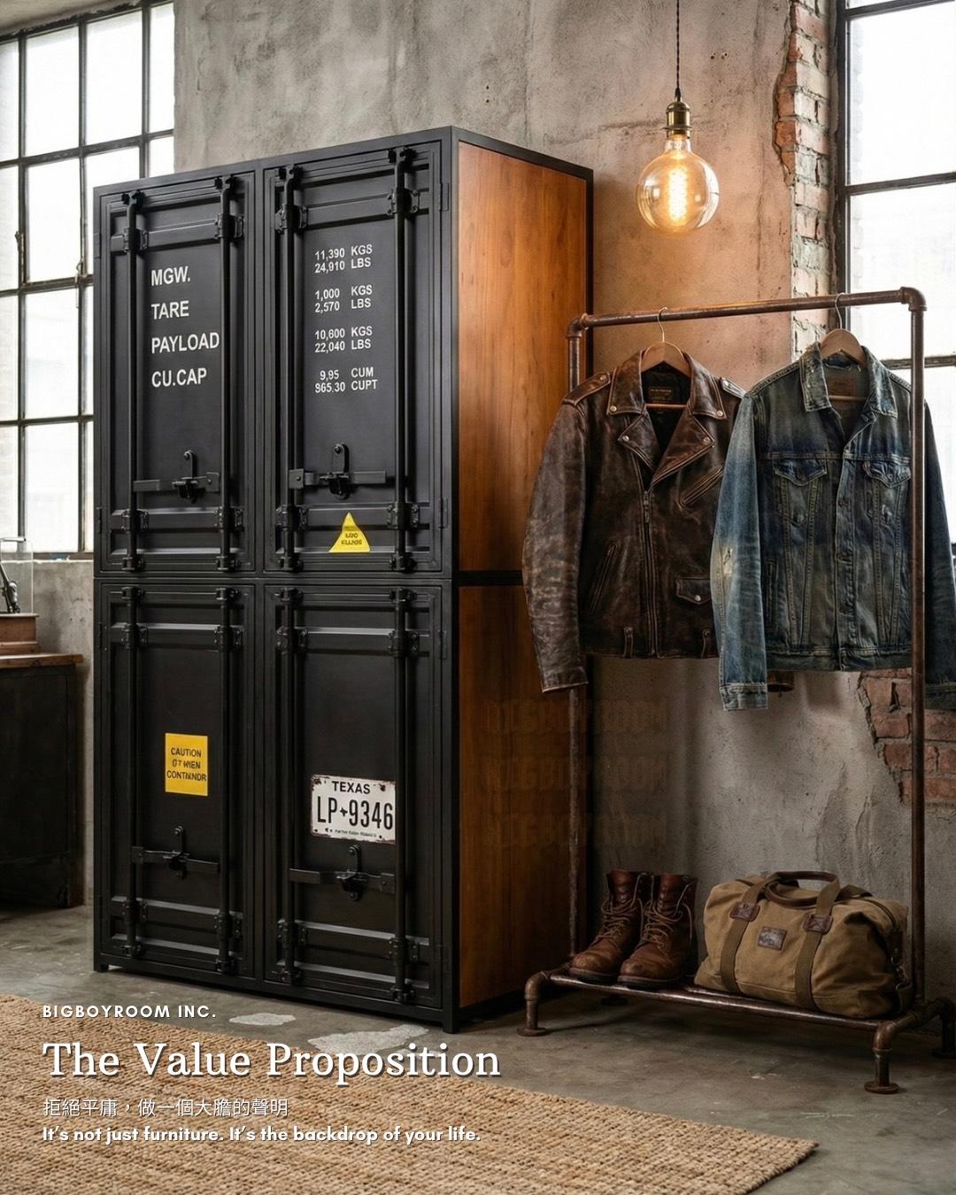 Container Series 美式風格鐵製衣櫃|屬於男人的硬派浪漫 The Soul of the Loft: 當空間有了性格,生活才開始 在 BigBoyRoom,這不只是一座衣櫃, 它是你 Man Cave 裡的軍火庫。 專為收藏你的 Leather Jacket、限量球鞋、各式珍藏與黑膠唱片而生。 The Vibe: 粗獷與紳士的靈魂共振 第一眼,你會被它的 Presence(存在感)驚艷。 這不是市面上常見的貼皮家具。 我們移除了多餘修飾,保留了海運貨櫃原本的工業符號——重型鎖桿、波浪板結構。 外層是冷冽的 Matte Black(消光黑)全鐵高溫烤漆,內裡卻是溫潤的 Solid Wood(全實木)。 剛毅與細膩的 Contrast(反差),就像穿著皮衣的紳士。 The Craftsmanship: 拒絕平庸的重工業規格 Full Iron Body: 厚實鐵件帶來的安全感,經得起時間的 Heavy Duty。 Real Wood: 打開門片撲鼻而來的實木香氣,這是照片拍不出來,必須親手觸摸的紮實。 Bespoke Service: 你的規格,由你定義 我們知道每個人的空間都是獨一無二的。無論是整面牆的展示系統,還是角落的獨立單品,皆可全客製化。 Case Study:照片款式規格參考 此配置方案是專為因應透天或公寓窄梯,需克服過道搬運難題而設計。我們特別採用了 Split-Body Structure(上下分拆結構): 單座單元:60 × 64 × 210 cm(可上下拆裝進場) 組合配置:180 × 64 × 210 cm (這意味著:無論是老公寓或透天,它都能靈活進場,無須妥協) Conclusion 始於顏值,終於工藝。 這是一件讓空間瞬間擁有「故事感」的 Statement Piece。 產品購買須知