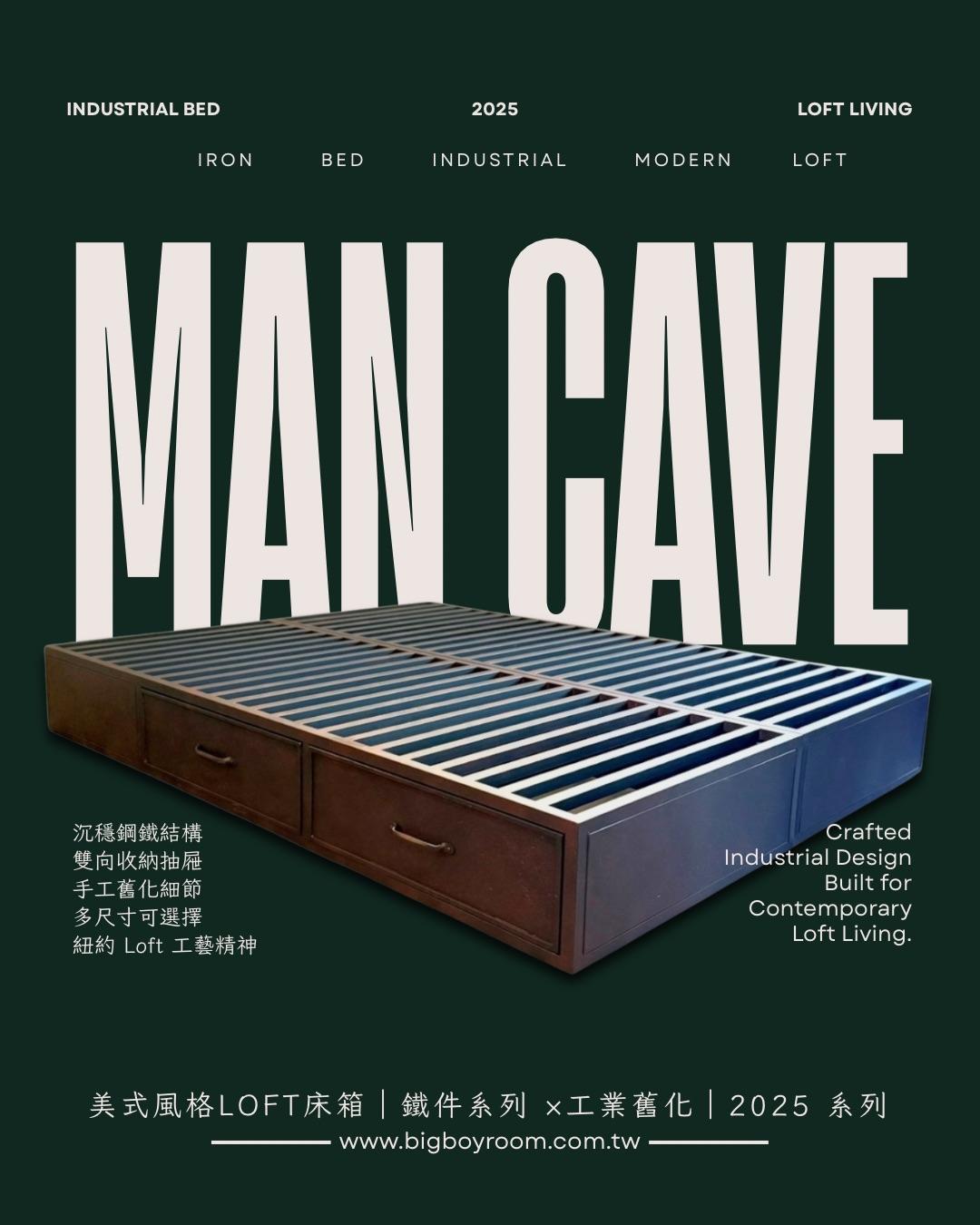 The Man Cave Starts Here 美式鋼鐵結構雙人床箱 ![]() 每個男人都需要一個能讓思緒沈澱的地方。 不必複雜、不必浮誇, 只需要結構、秩序, 以及一張會陪你很久的床架。 全鐵製的框架帶著冷靜的力量, 手工舊化留下時間感的質地, 邊角俐落乾淨——像一位沉穩的朋友, 不多話但夠可靠。 雙面收納抽屜靜靜藏在床側, 不打擾視覺、不搶空間, 卻讓每天的節奏變得更順、 更像你自己的步調。 這不是裝飾出來的 Man Cave, 是你慢慢建立、 也慢慢住進去的那一種。 Available Sizes Single(單人) Double(雙人) Queen(加大雙人) King(加大特大) 產品購買須知