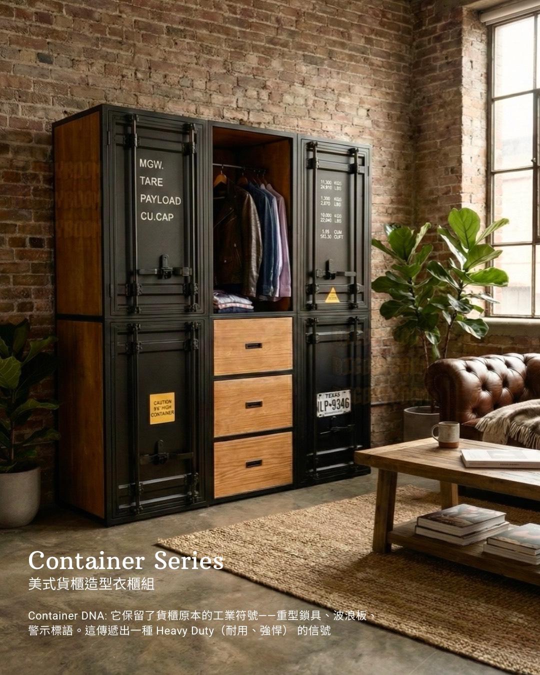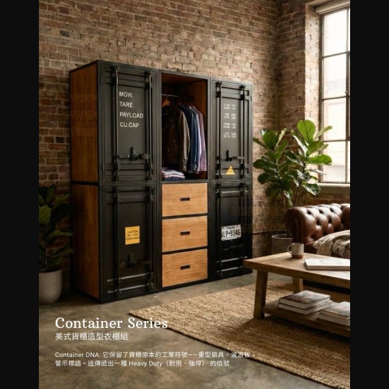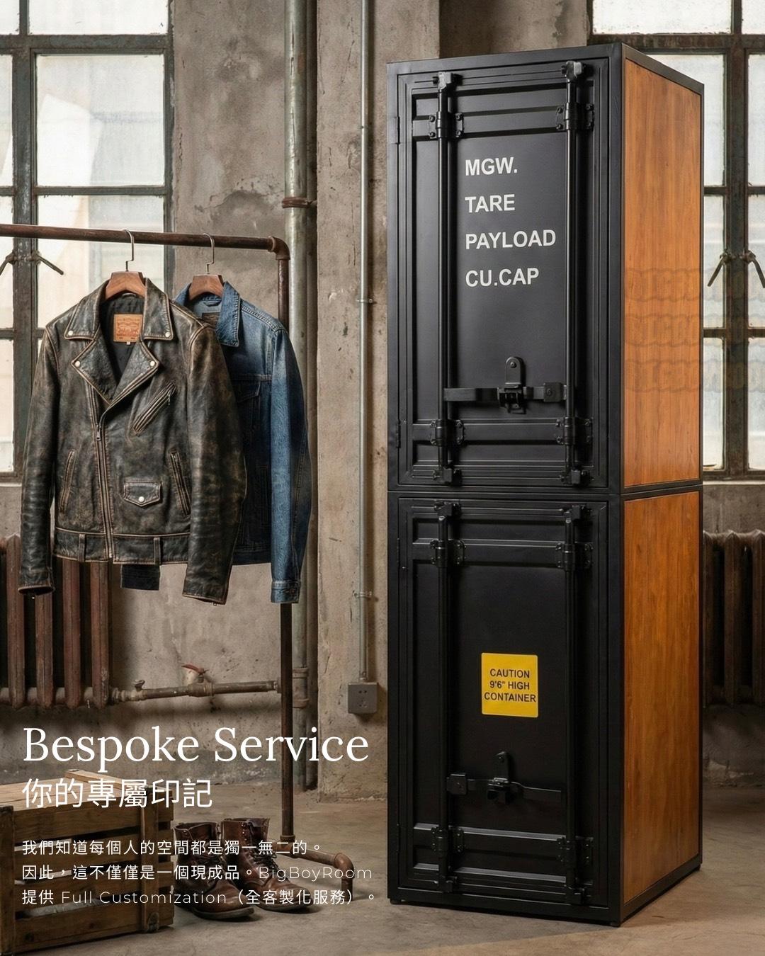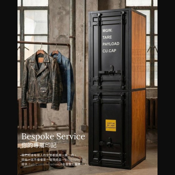 Container Series 美式風格鐵製衣櫃|屬於男人的硬派浪漫 The Soul of the Loft: 當空間有了性格,生活才開始 在 BigBoyRoom,這不只是一座衣櫃, 它是你 Man Cave 裡的軍火庫。 專為收藏你的 Leather Jacket、限量球鞋、各式珍藏與黑膠唱片而生。 The Vibe: 粗獷與紳士的靈魂共振 第一眼,你會被它的 Presence(存在感)驚艷。 這不是市面上常見的貼皮家具。 我們移除了多餘修飾,保留了海運貨櫃原本的工業符號——重型鎖桿、波浪板結構。 外層是冷冽的 Matte Black(消光黑)全鐵高溫烤漆,內裡卻是溫潤的 Solid Wood(全實木)。 剛毅與細膩的 Contrast(反差),就像穿著皮衣的紳士。 The Craftsmanship: 拒絕平庸的重工業規格 Full Iron Body: 厚實鐵件帶來的安全感,經得起時間的 Heavy Duty。 Real Wood: 打開門片撲鼻而來的實木香氣,這是照片拍不出來,必須親手觸摸的紮實。 Bespoke Service: 你的規格,由你定義 我們知道每個人的空間都是獨一無二的。無論是整面牆的展示系統,還是角落的獨立單品,皆可全客製化。 Case Study:照片款式規格參考 此配置方案是專為因應透天或公寓窄梯,需克服過道搬運難題而設計。我們特別採用了 Split-Body Structure(上下分拆結構): 單座單元:60 × 64 × 210 cm(可上下拆裝進場) 組合配置:180 × 64 × 210 cm (這意味著:無論是老公寓或透天,它都能靈活進場,無須妥協) Conclusion 始於顏值,終於工藝。 這是一件讓空間瞬間擁有「故事感」的 Statement Piece。 產品購買須知